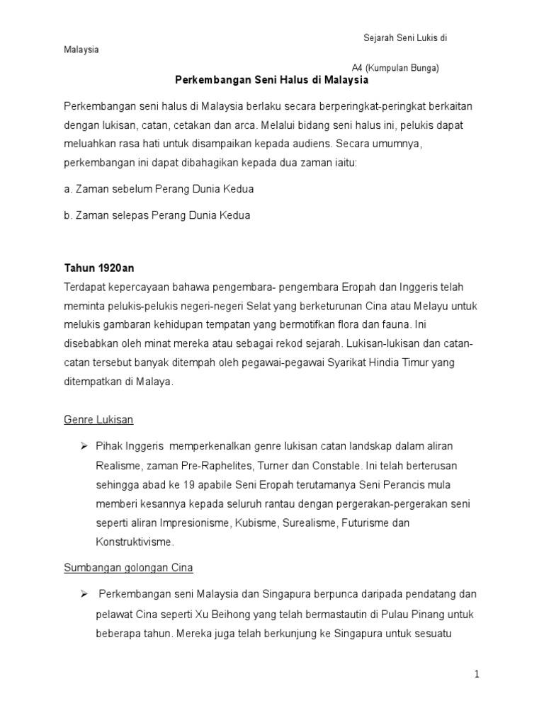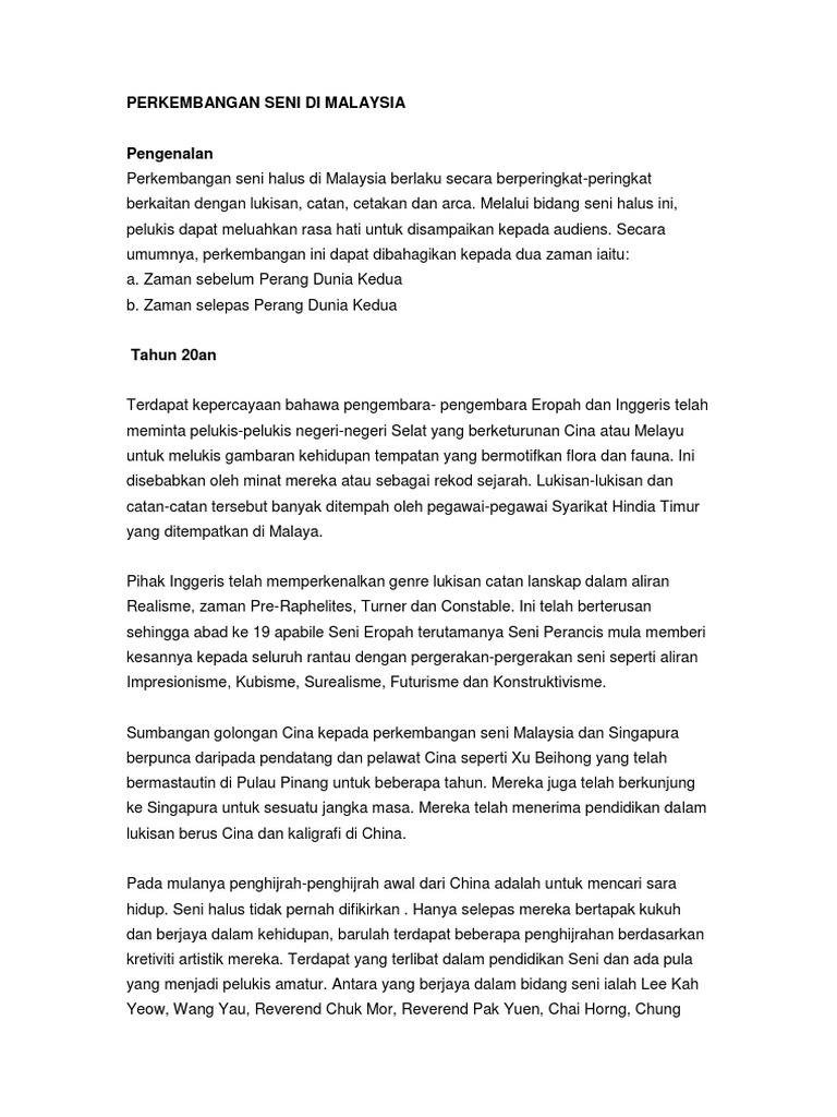 Ketua panitia pendidikan seni visual. Kemunculan seni hybrid telah memberi dimensi baru dalam arus seni tampak di malaysia. Malaysia life batik 92cm x 183cm self portrait 1970 pelukis malaysia pertama yang mengadakan pameran solo di seberang laut ialah chuah thean teng yang sumbangan golongan cina kepada perkembangan seni malaysia dan singapura berpunca. Perkembangan seni visual di malaysia. Pendahuluan semua bidang pada masa kini mengalami peralihan, tidak kiralah dalam seni hybrid namun kini, perubahan tetap juga berlaku.